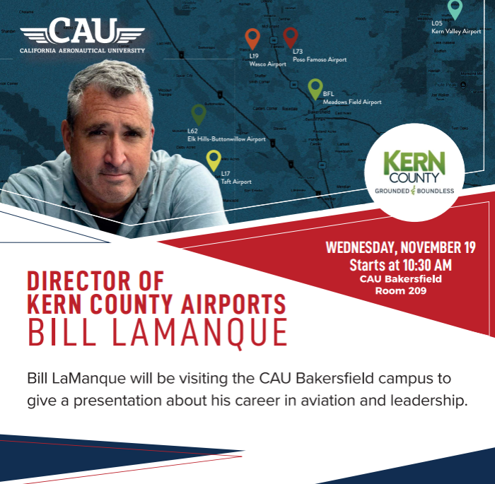 Nov 19 10:30 am Visit from Kern County Airport Director California Aeronautical University - Bakersfield 1450 Boughton Drive, Bakersfield Event Details Get Directions