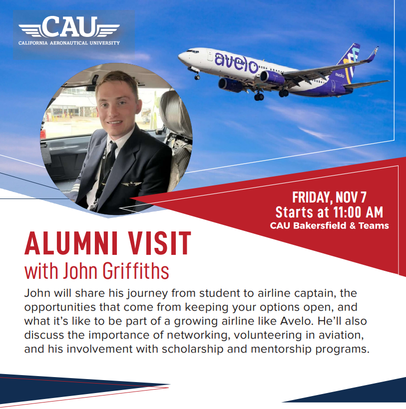 Nov 7 Featured 11:00 am ─ 12:30 pm CAU Alumni Visit – John Griffiths California Aeronautical University - Bakersfield 1450 Boughton Drive, Bakersfield Event Details Get Directions